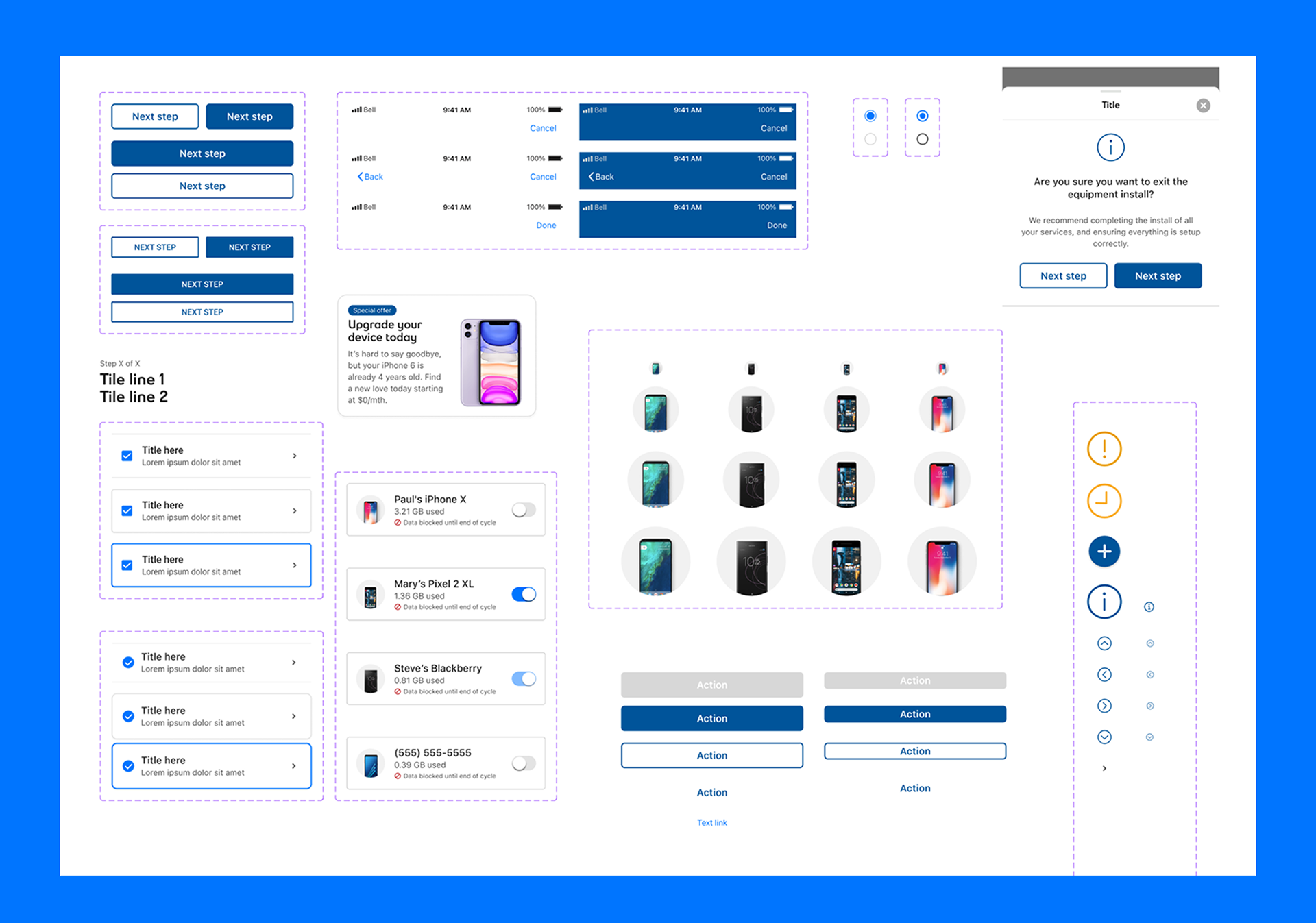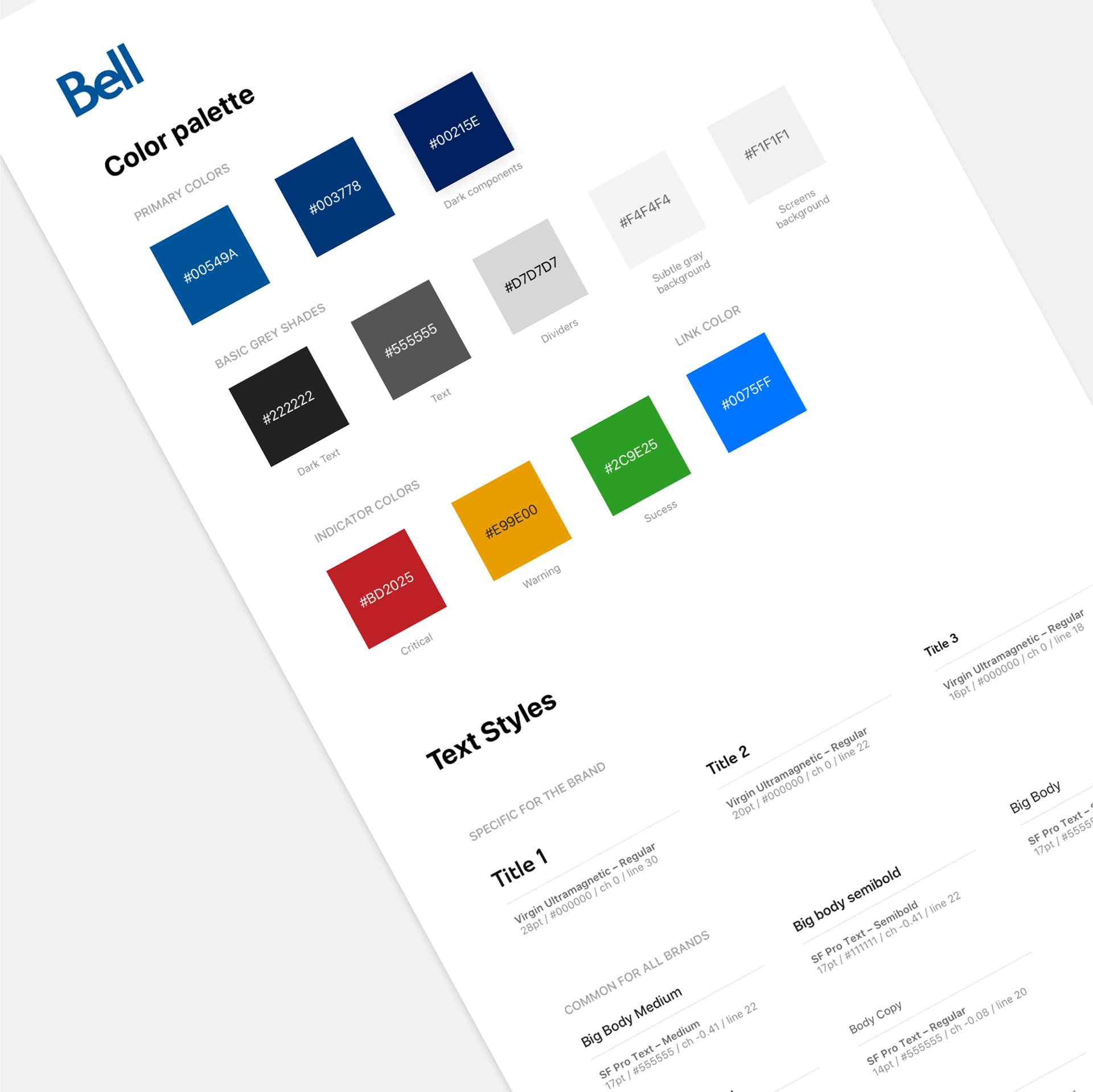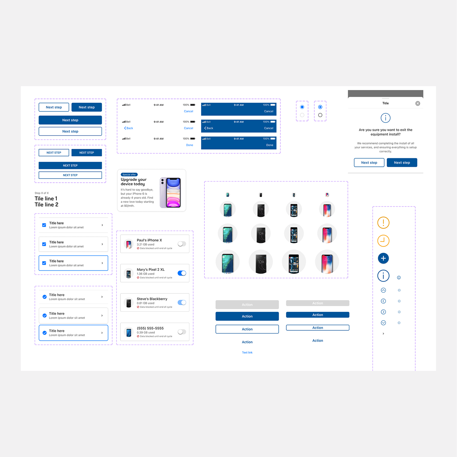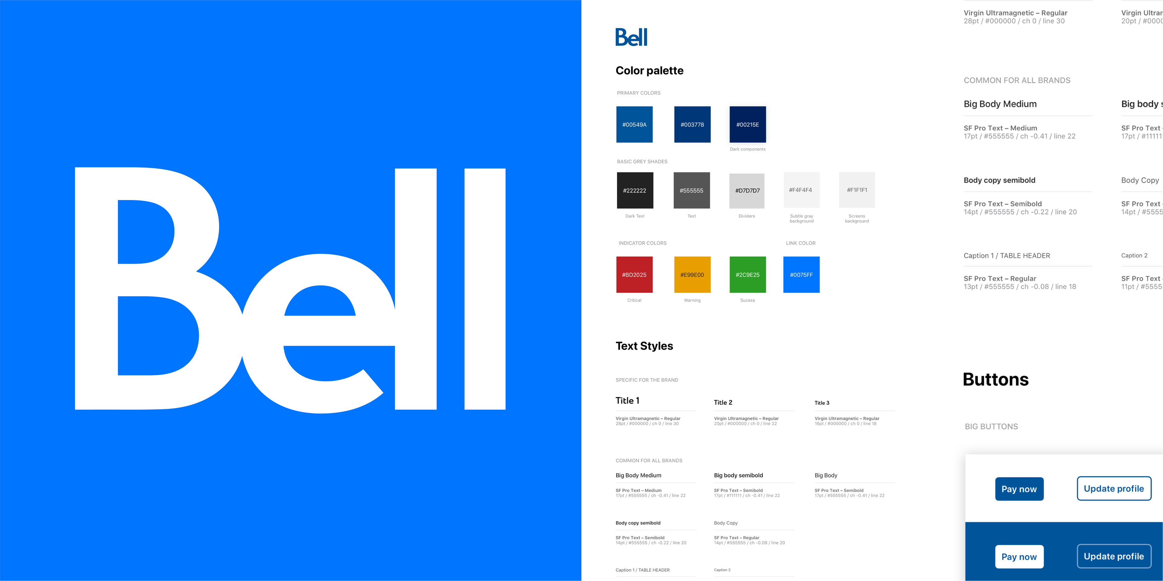 With different teams designing for Bell, Virgin, and internal tools, UI patterns had become inconsistent and hard to scale. There were duplicated components, mismatched styles, and fragmented handoff processes. This project focused on consolidating shared elements and enabling reuse across brands.
